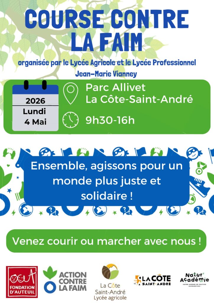 Le 4 mai 2026, dans le cadre du défi Natur’Académie, des élèves du lycée agricole et du lycée professionnel Jean Marie Vianney organisent au parc Allivet une Course contre la Faim réunissant près de 400 élèves de plusieurs établissements scolaires, ainsi que des résidents d’un EHPAD, autour d’un projet solidaire et intergénérationnel au profit d’Action contre la faim.